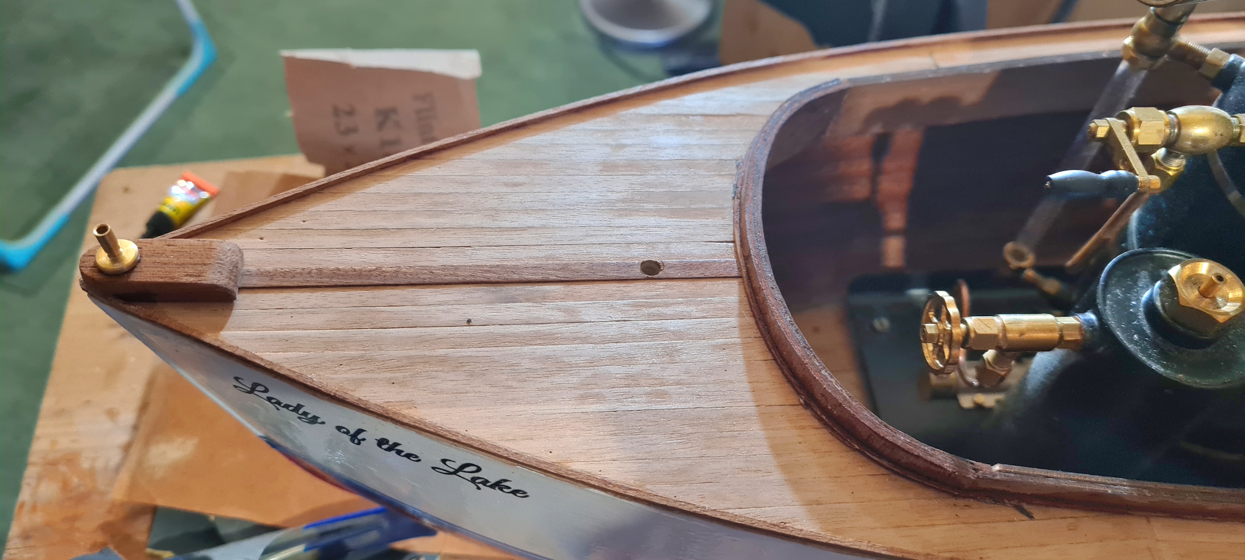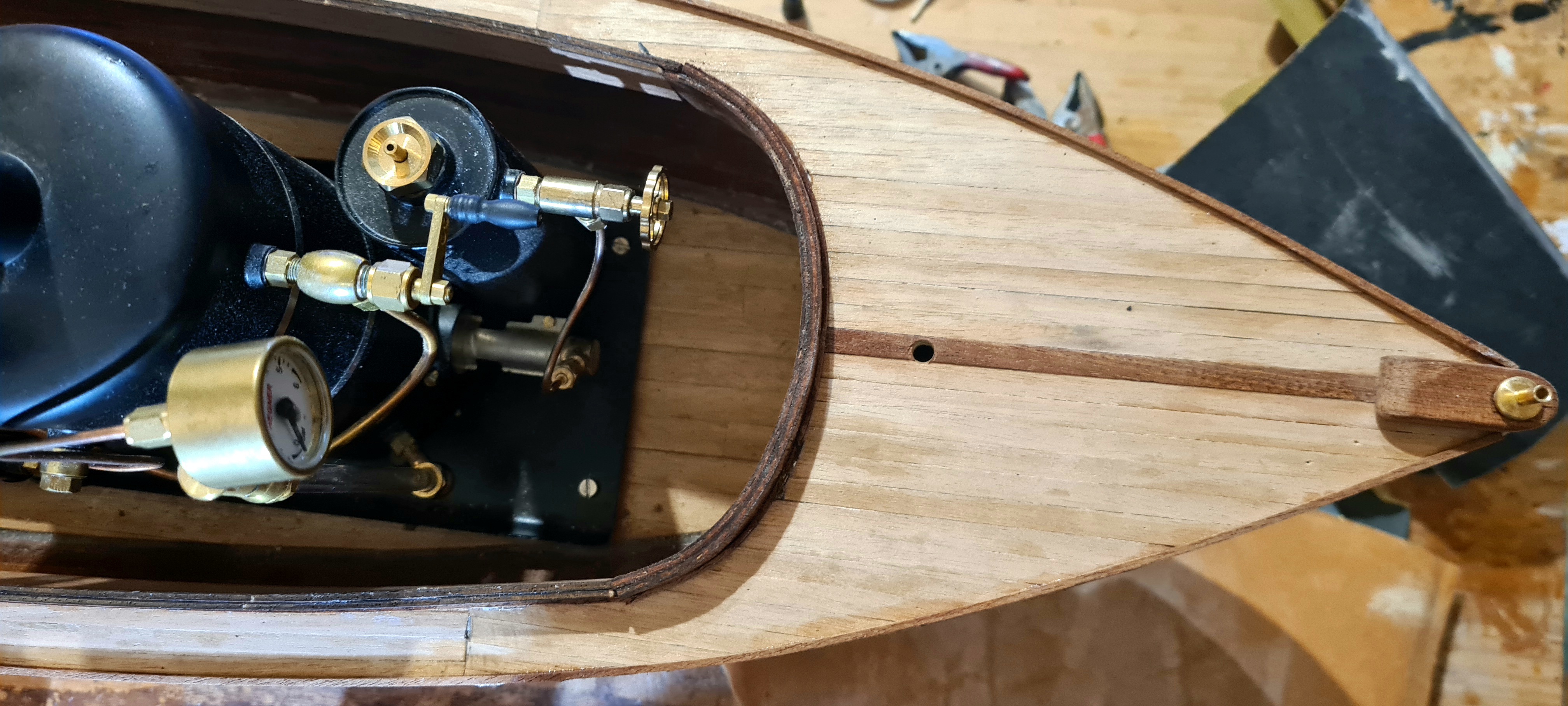 Die Arbeiten am Rumpf beschränken sich im Prinzip auf das Anfertigen und den Einbau von Schraubenwelle und Ruderanlage sowie auf die Lackierung. Die Schraubenwelle die dem Baukasten beiliegt ist zwar ok, ich habe sie trotzdem gegen ein viel leichter laufendes Exemplar mit Kugellagern ausgetauscht. Der vordere Teil des Rumpfes wird die Dampfmaschine aufnehmen die auf einem Steam Launch gerne frei steht. Nur bei größeren Exemplaren ist sie in einem eigenen Deckshaus oder sogar unter Deck untergebracht. Den Boden und die Wände habe ich beplankt und mit Klarlack lackiert, das vordere Schott zum Holzlager ist ebenfalls mit Mahagonileisten beplankt und mit einem Bullauge versehen. Lackiert wird die Lady mit Buntlacken auf Akrylbasis. Ich verwende Reinweiß (RAL 9010) für das Überwasserschiff und Rubinrot (RAL 3003) für das Unterwasserschiff. Der Wasserpass wir in Blau lackiert.